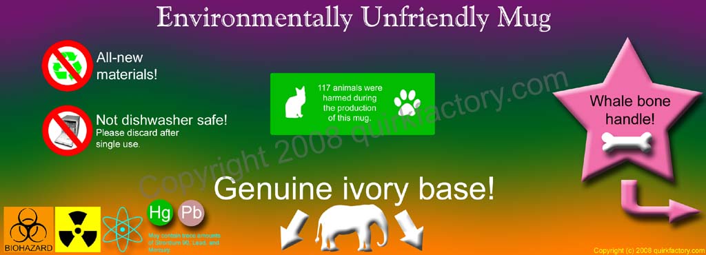 At work, they gave us "environmentallly friendly" green mugs made out of corn plastic. This inspired me to make my own Environmentally Unfriendly Mug Here's the image for the mug print: